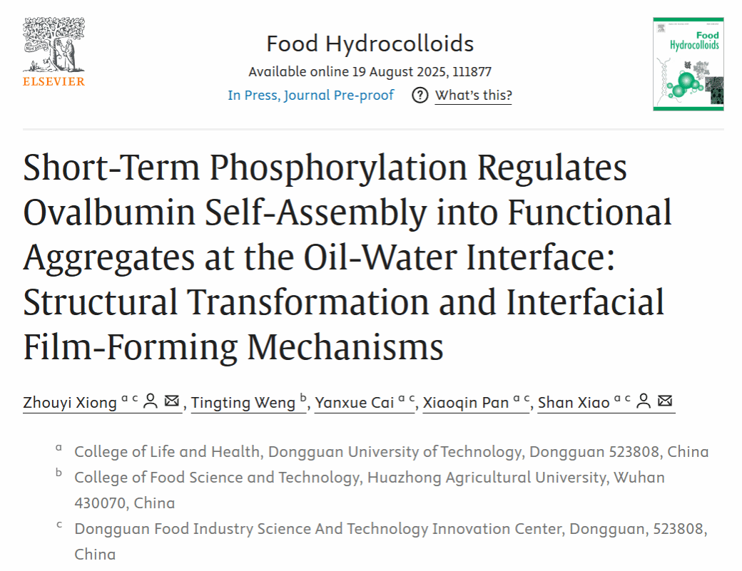 2025年8月,我院肖珊教授团队于国际食品顶级期刊《Food Hydrocolloids》(IF = 12.4)在线发表题为“Short-Term Phosphorylation Regulates Ovalbumin Self-Assembly into Functional Aggregates at the Oil-Water Interface: Structural Transformation and Interfacial Film-Forming Mechanisms”的研究性文章。论文第一作者为熊舟翼特聘副研究员,共同通讯作者为肖珊教授。