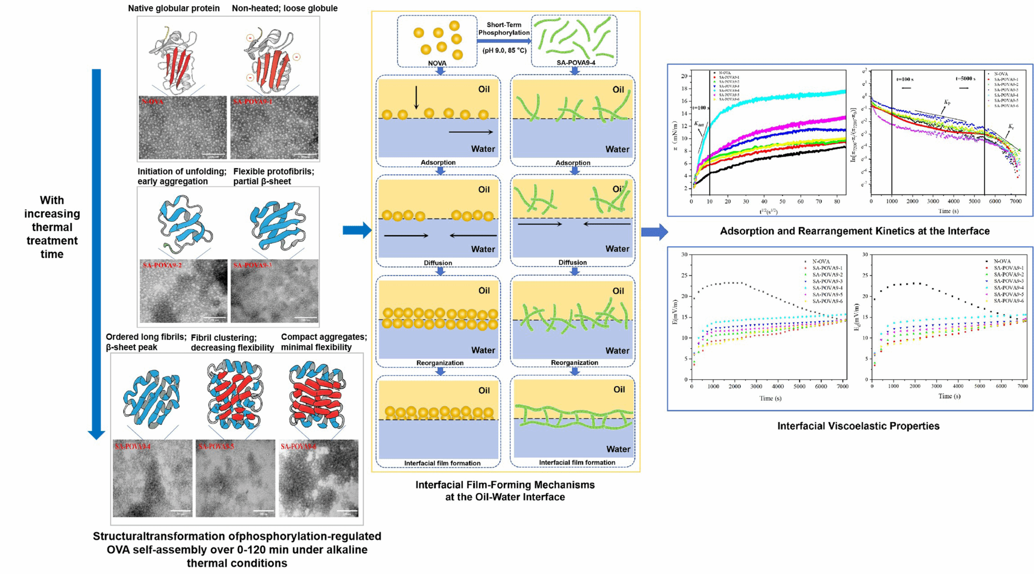 本研究探讨了短时磷酸化处理(0–120 min)对卵清蛋白(OVA)在碱性热条件(pH 9.0,85 ℃)下自组装及油-水界面膜层构建行为的影响。利用多尺度表征技术(FTIR、CD、ThT荧光、SAXS及TEM),结果显示磷酸化促进了卵清蛋白从天然球状结构向富含β-折叠的纤维状聚集体的结构转变。在各磷酸化样品中,SA-POVA9-4(60 min)表现出最高的β-折叠含量、更强的分子柔性以及丰富的延展纤维结构,代表了向有序功能性聚集体演变的关键阶段。在油-水界面上,磷酸化卵清蛋白组装体展现出显著增强的吸附、穿透和动态重排能力,从而促进了界面膜层的形成。其中,SA-POVA9-4实现了最高的界面蛋白浓度及优化的动力学参数(Kdiff、Kp、Kr),并伴随膨胀模量(E)和膨胀弹性(Ed)的稳定提升,反映出其卓越的界面结构稳定性和适应性重组能力。界面CD分析进一步证实了吸附后β-折叠片结构的保持,揭示了体相自组装与界面膜层功能形成之间的直接耦合关系。综上,研究表明短时磷酸化可作为一种快速、可控的策略,将卵清蛋白调控为富含β-折叠的聚集体,其可调控的自组装行为可直接转化为优异的界面膜层构建性能,为设计具有定制化界面功能的清洁标签蛋白类水凝胶提供了理论基础与技术路径。