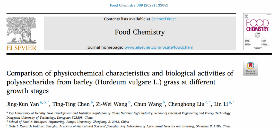 2022年4月,永利y23455食品营养健康工程与智能化加工研究中心闫景坤教授(第一作者)在国际食品顶级期刊《Food Chemistry》(IF: 9.231, Q1)发表了题为“Comparison of physicochemical characteristics and biological activities of polysaccharides from barley (Hordeum vulgare L.) grass at different growth stages”的研究论文。