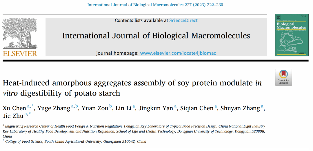 2022年12月,永利y23455食品营养健康工程与智能化加工研究中心陈旭博士(第一作者兼通讯作者)和朱杰副教授(通讯作者)在国际食品顶级期刊《International journal of biological macromolecules》(IF: 8.025, Q1 TOP)发表了题为“Heat-induced amorphous aggregates assembly of soy protein modulate in vitro digestibility of potato starch”的研究论文。