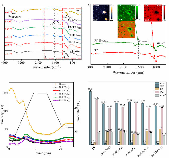 同时,在模拟蒸煮条件下构建了马铃薯淀粉-大豆分离蛋白无定形聚集体的复合物(PS-SPAA),探究其理化、形貌、结构和体外消化特性。研究发现,SPAA可以提高PS的热稳定性,降低PS的糊化粘度,提高其短程有序性。在模拟蒸煮条件下,由于SPAA的物理包裹或吸附以及与PS的非共价相互作用,可以明显降低PS的消化速率。不同温度处理下的SPAA对淀粉消化表现出不同的抑制作用,其中PS-SPAA130呈现出最明显的效果。SPAA对α-淀粉酶没有抑制作用。研究结果对丰富蛋白调控淀粉消化的作用理论,促进具有抗消化性的营养健康食品开发具有重要意义。