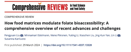 2024年3月,我院李琳教授团队在国际食品顶级期刊《Comprehensive Review of Food Science and Food Safety》在线发表题为“How food matrices modulate folate bioaccessibility: A comprehensive overview of recent advances and challenges”的综述文章。刘丰源助理研究员为论文第一作者,李琳教授为通讯作者。