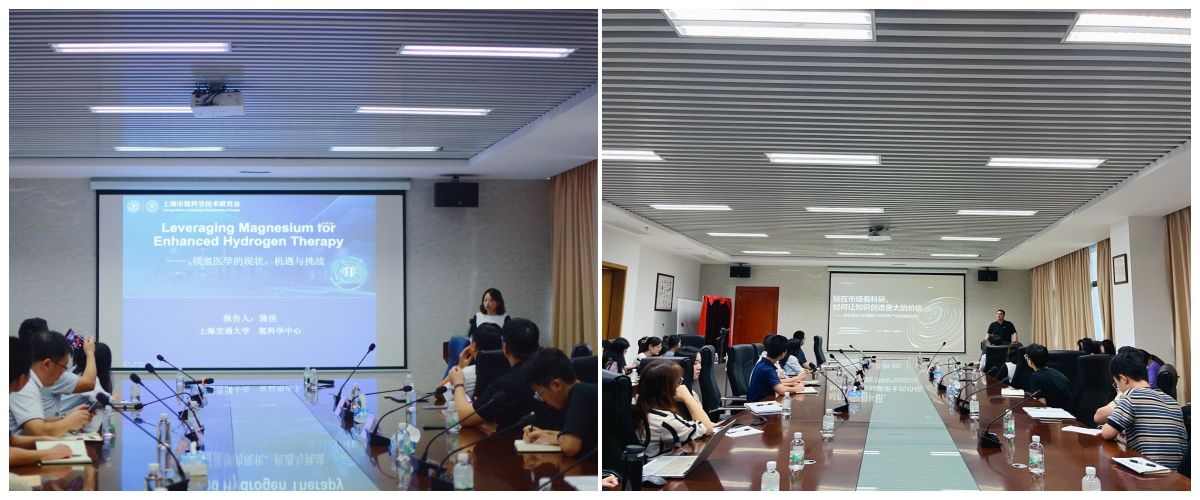 讲座期间,丁之光博士对上海交通大学氢科学中心进行了介绍;上海交大材料科学与工程学院教授、国家优秀青年科学家基金获得者裴佳教授介绍了氢在生物与医药领域的科研和应用进展,并和现场的师生进行了探讨和交流;“每年轻”品牌创始人、生物与医药专业硕士校外导师周孝华则从市场角度分享了如何让科研创造更大的价值。